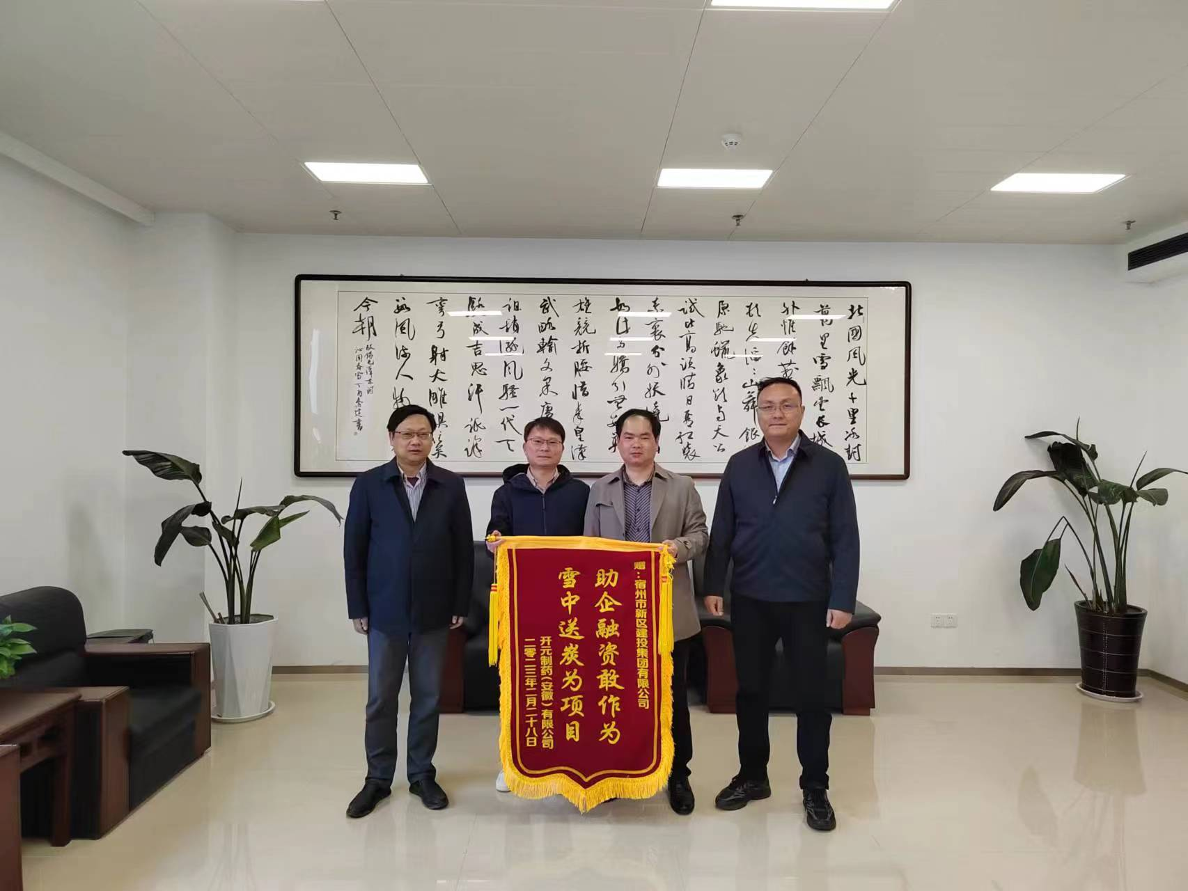 4月6日,開元制藥(安徽)有限公司燕立波總經(jīng)理親自贈送寫有“助企融資敢作為,雪中送炭為項(xiàng)目”的錦旗一面,并表示新區(qū)建投通過實(shí)實(shí)在在的舉措,解決企業(yè)資金周轉(zhuǎn)難,融資難的問題,幫助企業(yè)渡過經(jīng)營難關(guān),讓企業(yè)“輕裝上陣”,體現(xiàn)了國企的擔(dān)當(dāng)。