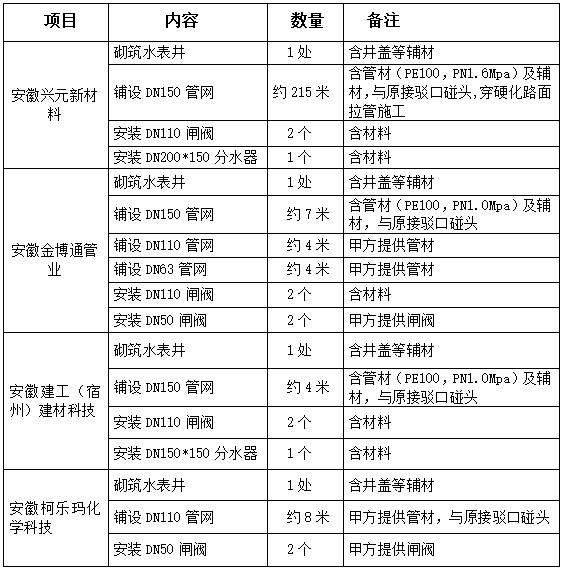 一、項(xiàng)目名稱:安徽興元新材料、安徽金博通管業(yè)、安徽建工(宿州)建材科技、安徽柯樂瑪化學(xué)科技公司自來(lái)水接駁勞務(wù)施工項(xiàng)目