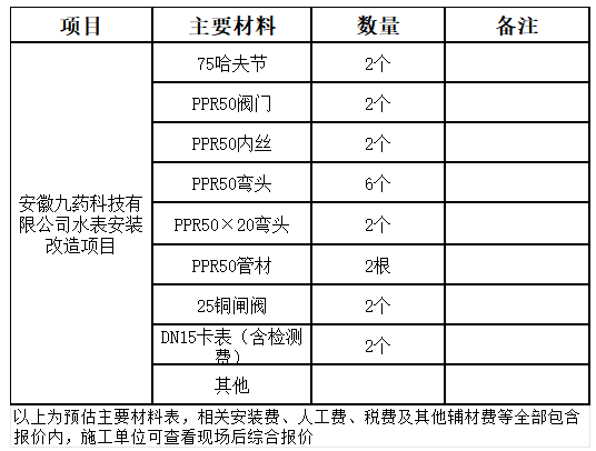 五、施工內(nèi)容:對(duì)生物醫(yī)藥科技園兩處廠房供水總表處水管進(jìn)行改造,從總表水管處新分支管至其他樓層并加裝水表,所有主材及輔材由勞務(wù)單位自行準(zhǔn)備,改造后原表及分表均可獨(dú)立供水計(jì)量滿足使用需求,主要材料如下(可聯(lián)系我公司踏勘現(xiàn)場(chǎng)):